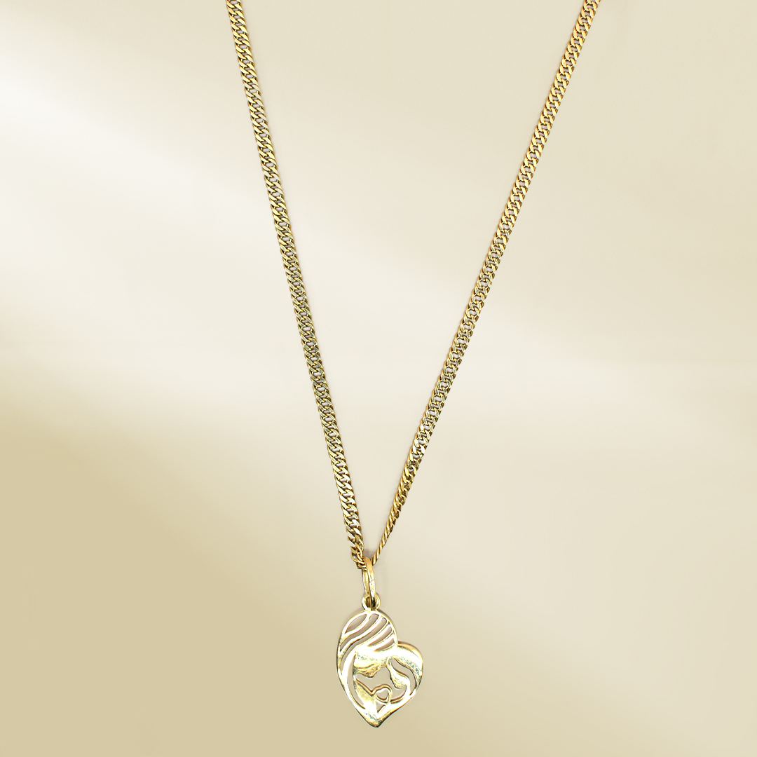 18K Yellow Gold Curb Chain Necklace with Mother and Child Heart Shaped Pendant