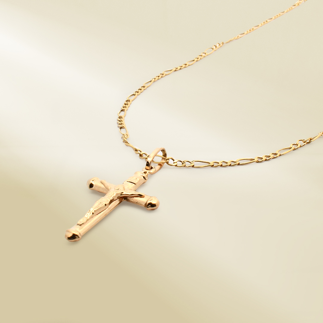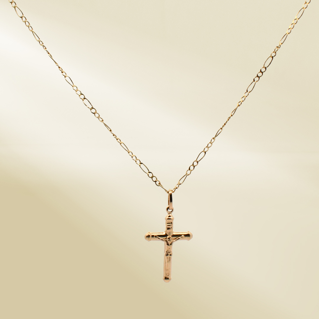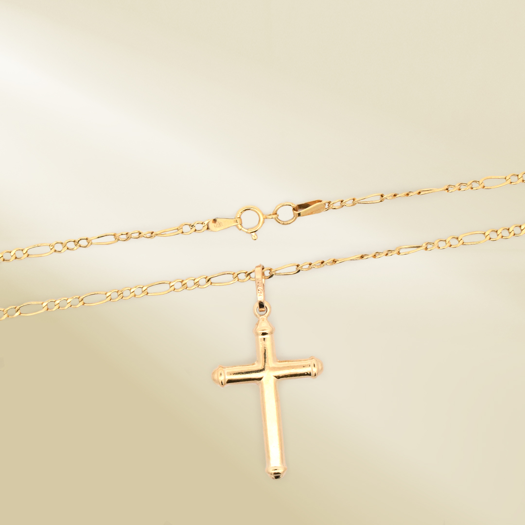 18K Yellow Gold Figaro Chain Necklace with Cross Pendant